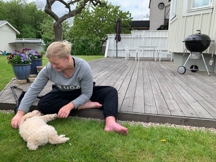 Igår badade jag i havet för första gången. Jag är dock mycket skeptisk till det där med vatten. Men efter lek och lite övertalning från mamma hoppade jag i. När jag kom tillbaka på land igen rullade jag mig i sanden. Hela jag var sandig, så roligt. Mamma var lugn, mormor desto mer bekymrad. Hon undrade hur de skulle klara att borsta av mig all sand innan jag skulle hoppa in i bilen igen. Men, nu ska jag berätta en sak: när vi spanska vattenhundar blir torra efter saltvattenbad och lek i sanden försvinner all sand. Vår päls mår så bra av både saltvatten och sand. Så sand i bilen blev inget problem.